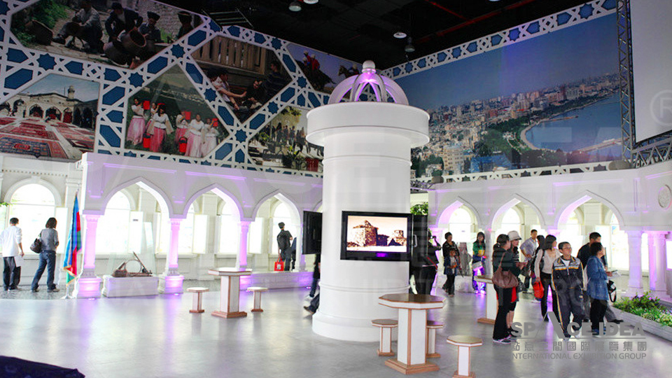 阿塞拜疆是一個具有43個名族的多民族國家,多民族帶給了這個國家多樣的文化,展館以藍色、金色、白色為主色調,富有濃郁的歐亞風情。館內以多媒體、特色手工藝品、圖片等展現了阿塞拜疆城鎮的歷史、文化、宗教、城市居民的生活方式等,凸顯了該國地處連接東西方的“十字路口”的重要性,以及在融合東西方文化、促進貿易和交流中的“橋梁”作用。展館講述了阿塞拜疆城鎮的現狀,揭示了阿塞拜疆民族精神的基礎:與世界各民族合作,尊重各自的歷史、文化和信仰。古阿塞拜疆的領土被視為偉大的絲綢之路的一部分。現今,阿塞拜疆位于東西大陸的交接口。 歐亞大陸地緣政治的版圖(輪廓)依舊穿越阿塞拜疆的領土。東西方之間的價值觀、信息和知識一度都是通過這些歷史路線來傳送的。同時,它們在世界范圍內首次促使了科學和文化傳統在絲綢之路國家間的交流。正因為阿塞拜疆位于東西方的十字路口,所以,新千年積極執行TRACECA項目使得阿塞拜疆的歷史作用已經得到加強。