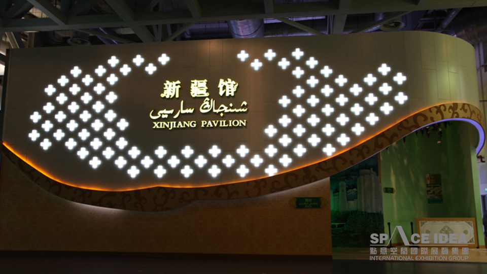 新疆館的主題為“新疆是個好地方”。新疆館外觀選取新疆獨(dú)有的造型元素,用單一的符號做矩陣式的排列,巨大的體量和形式符號,簡約主義的風(fēng)格形成第一視覺沖擊力,以虛實(shí)結(jié)合的表現(xiàn)手法讓觀眾第一眼就認(rèn)出——這就是新疆館。底部空間半通透的設(shè)計(jì)寓意為將要掀起的蓋頭,透視出內(nèi)空間華美的鋪陳,“我們新疆好地方”熱情的歌聲隱約傳來,讓觀眾立即能從視覺、聽覺、色彩上識別新疆館,直觀、簡約、大氣。