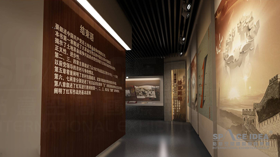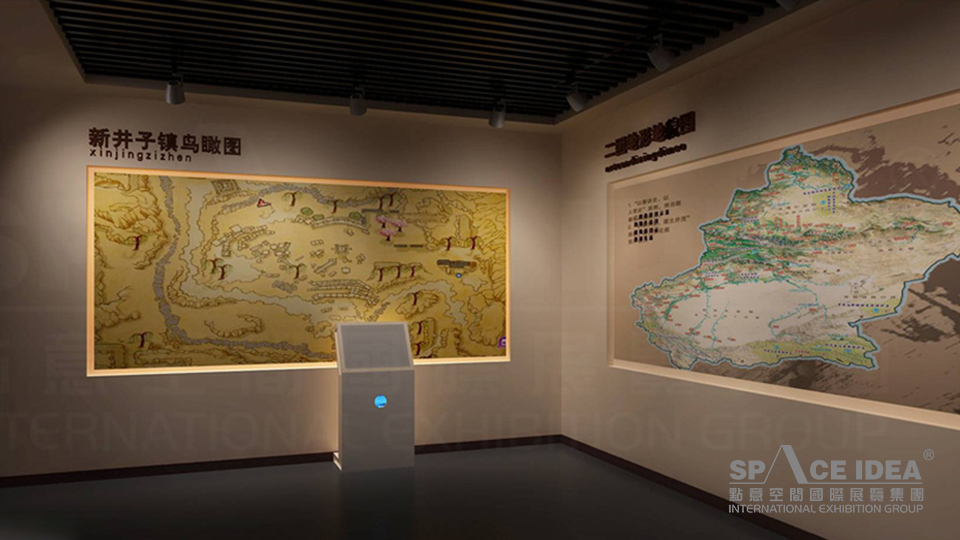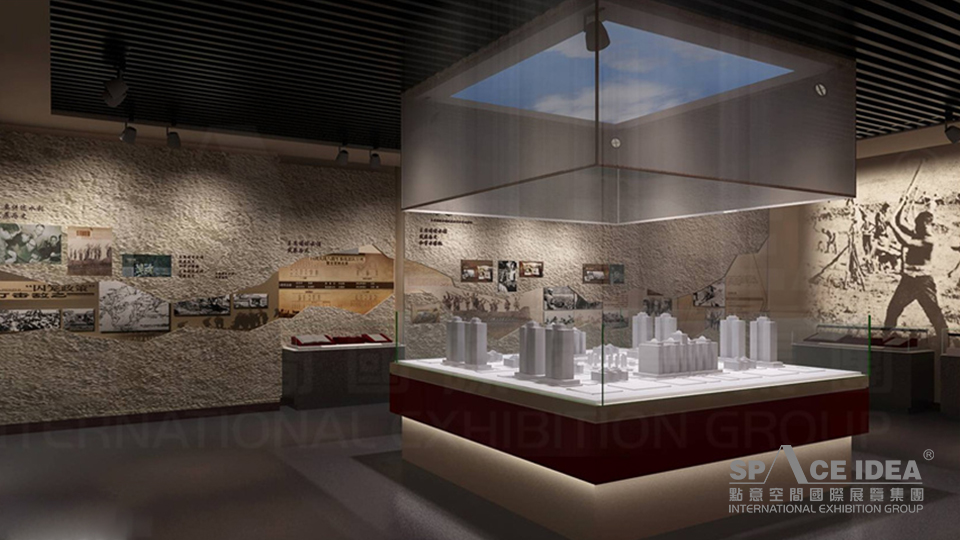 展廳中央藍天白云設計元素源于“開天”,左面展區設計元素源“辟地”,寓意老一輩二團軍民開墾家園、艱苦奮斗的開疆精神;右側展墻以中國古樸紅色為主色調,寓意二團軍民在黨中央指導思想的包容和關懷下,共創新井子鎮(中央沙盤)美好的明天。