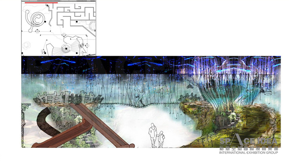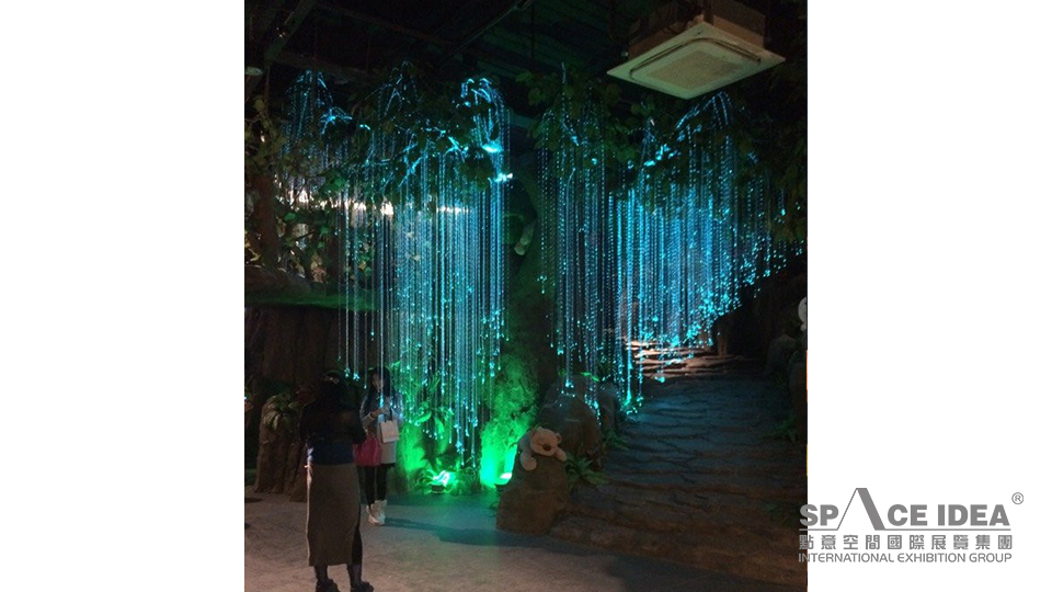 第四個展廳就充滿童趣了,仿佛叢林般的場景:巖洞中的星星點點、不經意的探頭熊叫,使驚魂山洞充滿神秘色彩;沿路而上進入叢林索橋,意想不到的滑梯體驗,帶來趣味無限。