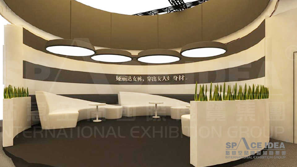 接待區(qū)采用半弧形的設(shè)計,給人一種環(huán)抱的感覺,寓意婭麗達希望社會各界加入其團隊,接待背景墻用立柱的形式表現(xiàn),打破了整個展位弧形的曲線,使整個展位的形式不再單一更加豐富。