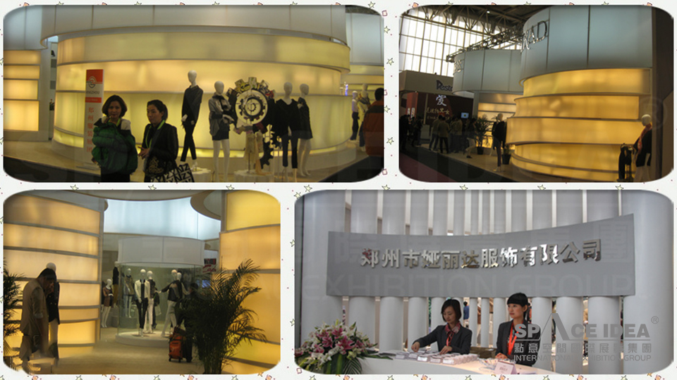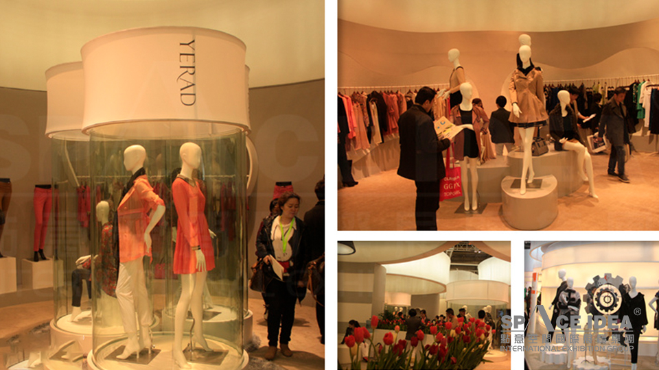 兩個展示區(qū)采用對角線的方式,夸張的造型,配上婭麗達靚麗的服飾,使整個展位更加高檔。