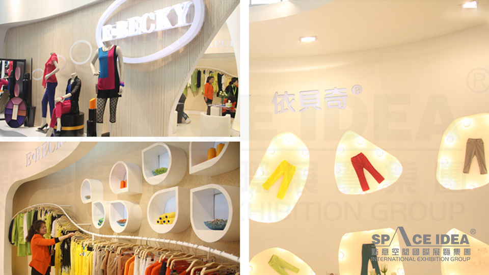 3、內部設計延伸外部設計元素,是外部設計的延伸,局部點綴軟膜發光造型,并配合模特展示制造小型展項效果。側邊陳列展架隨著內部結構起伏鑲嵌其中,側掛為主,模特展示,正掛,疊放等各種方式展示為輔助。小品、接待臺、中導等陳列架,包括形象墻和櫥窗的設計取材外部結構,點綴以鏤空造型,使整個展位能夠融為一體。