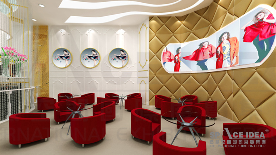 2、色彩說明:玫瑰金色的為主色調,凸顯華貴、典雅、時尚,雙色地毯的拼接設計豐富了空間效果,同時根據人眼部對色彩接受的能力細分,起到了對參展者導視的作用。