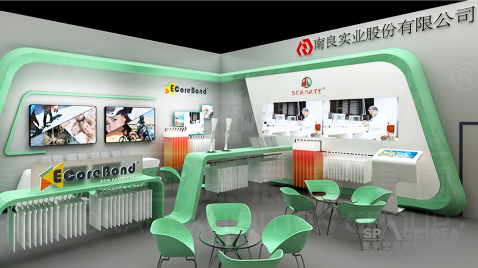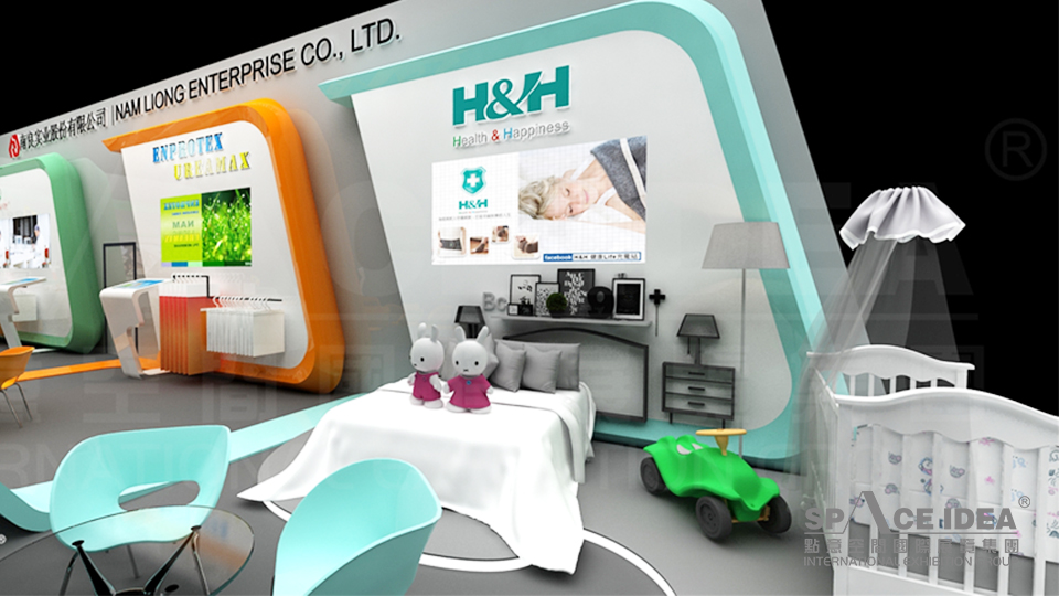 整個展臺由藍色、橙色、綠色分割成三部分,分別展示南良實業的三大類產業:健康及醫療用品、綠色無公害食品及綠能節能產業,寓意著南良實業的企業愿意:健康、快樂與希望。整個設計結構嚴謹、條理清晰,配合發光字、觸摸屏及燈箱畫面,詳細展示了南良實業「對生命之尊重、對環境之愛護」的核心價值觀。