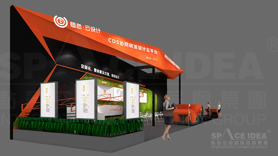 色彩上主要運用橙色和黑色為主基調,結合深灰色的地板及綠色的背景墻,通過視覺的強烈對比營造強烈的空間感,極具時代氣息,體現了橙色云歡快光輝、充滿活力的企業形象及活潑開放、不失嚴謹的創新精神。通過大型LED屏,播放橙色云自主開發的全球第一個協同設計系統OrangeCDS(即全球協同設計云)、背景墻上陳列著的橙色云企業簡介,來展示橙色云高效、快捷、優質的企業文化。