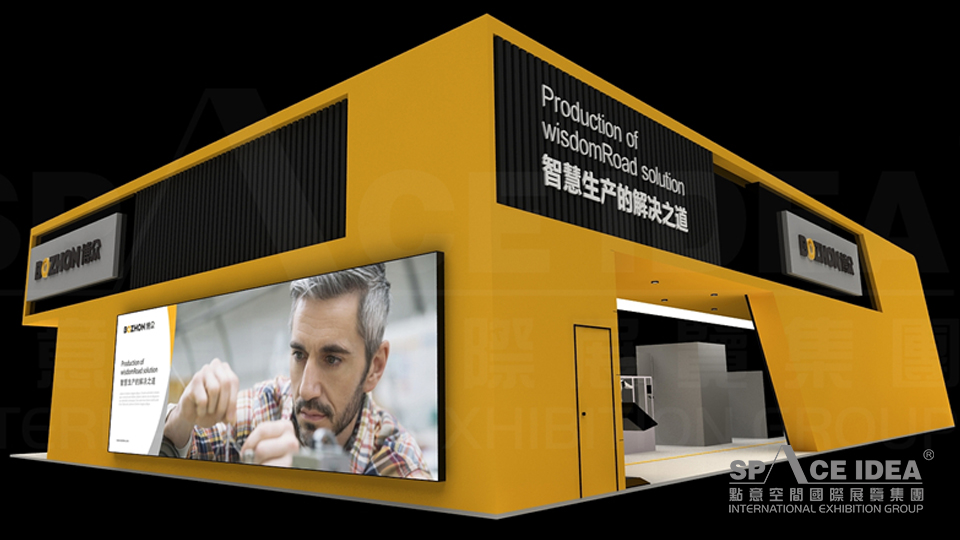提取博眾品牌LOGO中的黃色及黑色來進行環境的渲染,營造半封閉空間來進行展示,通過場景的修飾、道具的展開,給人一種非常高端的感受。選擇現代感極強的高分子化合物與不銹鋼相結合的材料,體現博眾專注智能制造,以技術創新為核心的企業形象。休息區域桌椅均采用高分子化合物為主材料進行展具的排列,整體風格一致,又相互映襯。